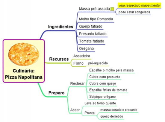 Veja o exemplo abaixo: o primeiro mapa mental é o da pizza, que tem como ingrediente a massa, para cuja receita há outro mapa mental, mostrado a seguir (com alguns tópicos de detalhamento contraídos).