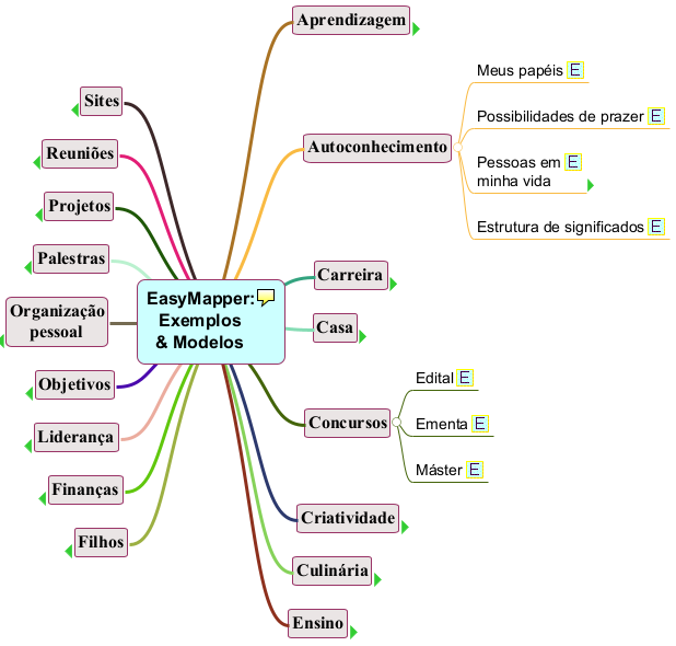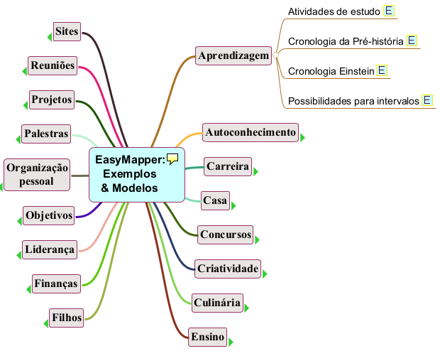 O EasyMapper (como qualquer bom software de mapas mentais) tem um recurso de contração de tópicos que permite que se configure visualizações particulares de um mapa mental, nas quais alguns ramos são exibidos e outros não. Por exemplo, o mapa mental a seguir exibe completamente apenas dois ramos.