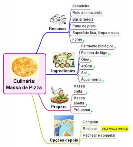 Veja o exemplo abaixo: o primeiro mapa mental é o da pizza, que tem como ingrediente a massa, para cuja receita há outro mapa mental, mostrado a seguir (com alguns tópicos de detalhamento contraídos).