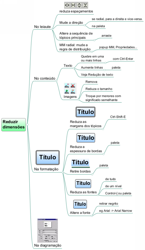 Quando o mapa mental não está muito grande, uma direção de boa aplicabilidade para reduzi-lo é reduzir suas dimensões. Para isso, há quatro linhas de atuação: