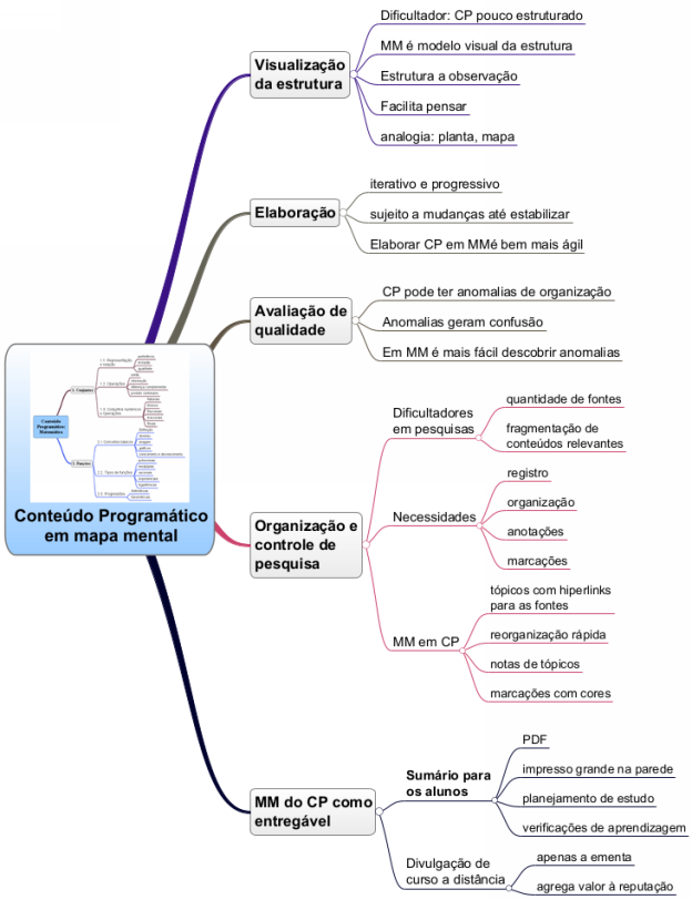Montando cursos, usei mapas mentais para várias finalidades interessantes; em particular, o mapa mental do conteúdo programático foi utilíssimo. Neste artigo descrevo várias possibilidades de uso de mapas mentais para trabalhar conteúdos programáticos, que podem trazer mais conforto, qualidade e produtividade nessa tarefa tão importante para o planejamento do ensino-aprendizagem.