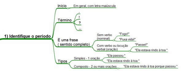 Peguei o livro-texto de Português e percorri os capítulos, selecionando o conteúdo relevante e colocando no mapa mental, seguindo a estrutura do livro: sujeito, predicado, verbo, objetos direto e indireto, classificação das orações e por aí vai, com subtópicos de detalhamento. Essa primeira versão ficou semelhante à abaixo (o original não foi preservado):