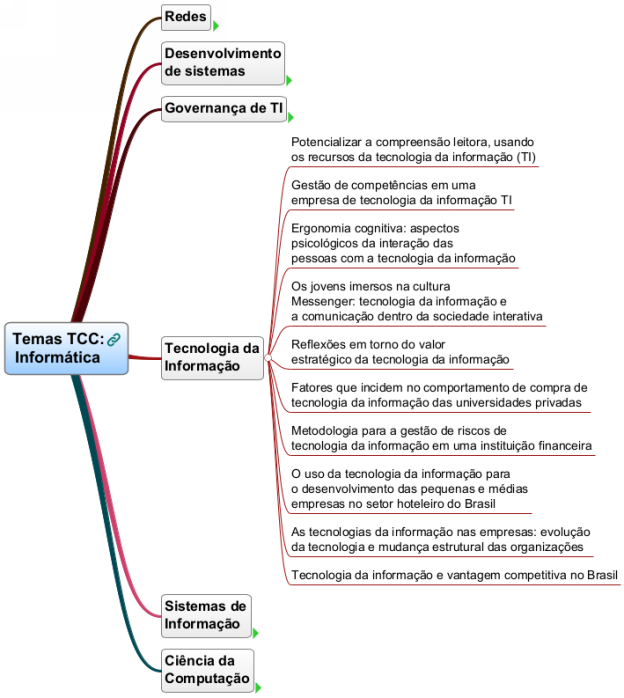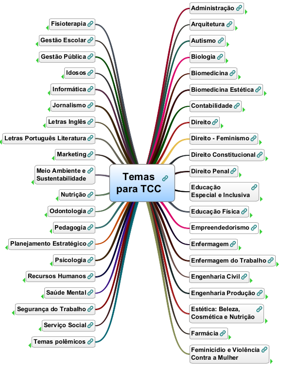 O site Temas para TCC fez um ótimo trabalho fornecendo centenas de ideias para TCC, organizadas em dezenas de áreas, como Arquitetura, Psicologia e Informática. Mas a consulta a tantas informações pode não ser a mais ágil possível, assim fizemos um mapa mental para facilitar.