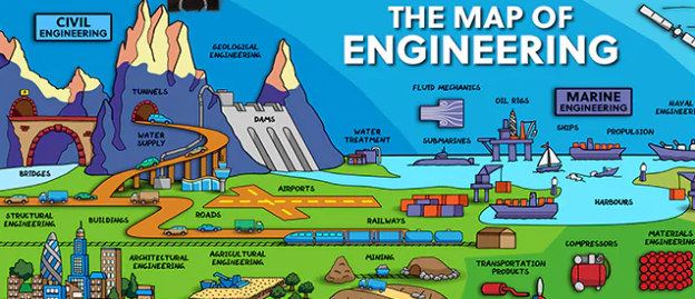Por exemplo, o mapa da Engenharia inclui as engenharias Civil, Mecânica, Elétrica, Química, Marinha, Ambiental, Aeroespacial e por aí vai. Abaixo você pode ver um trecho desse mapa.